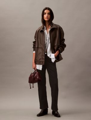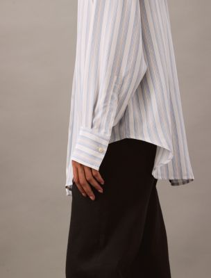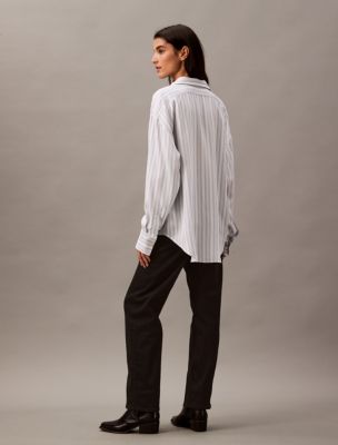 Designed in a yarn-dyed subway stripe for a standout look. This Calvin Klein button-down shirt is crafted from super soft viscose with relaxed shaping. Detailed with drop shoulders and a shirttail hem.